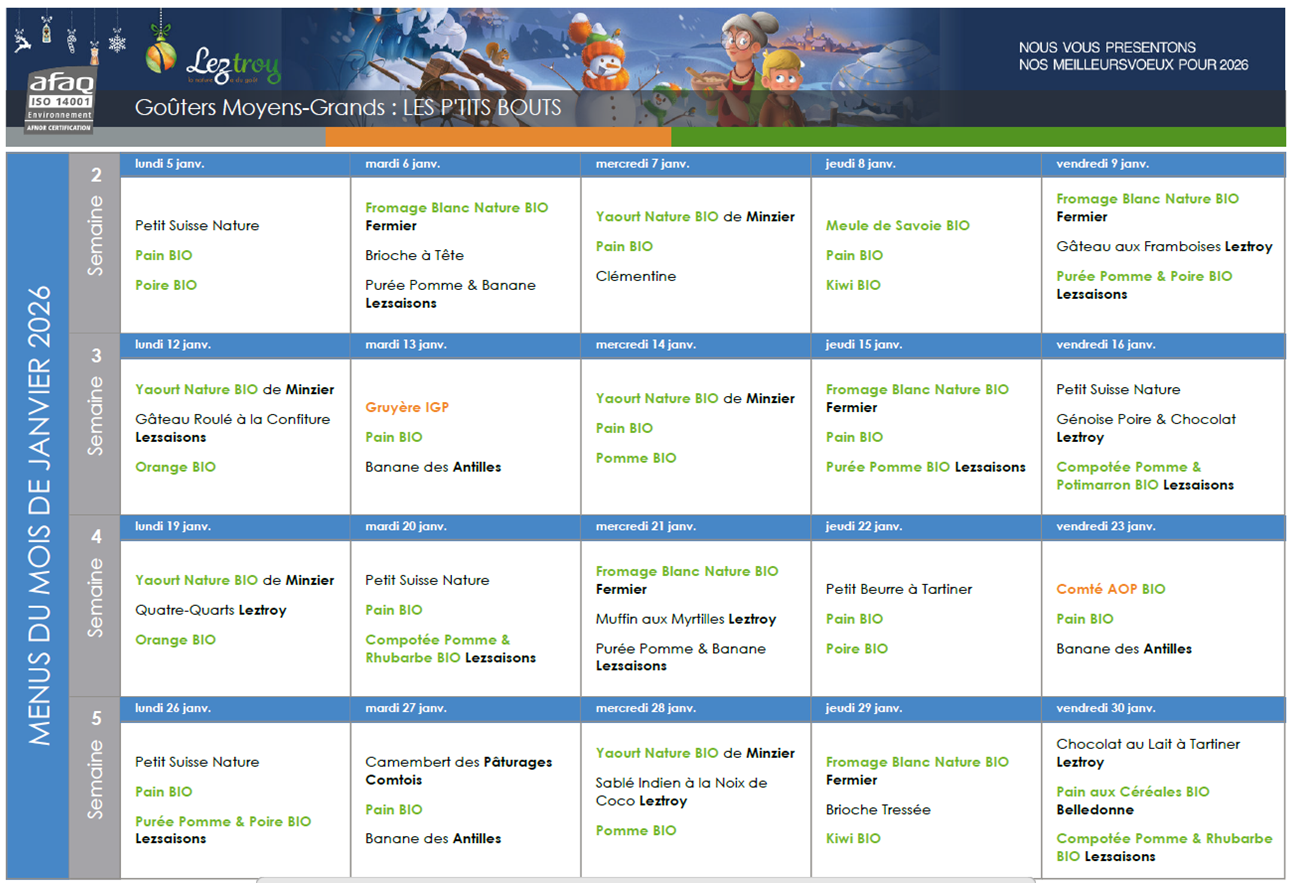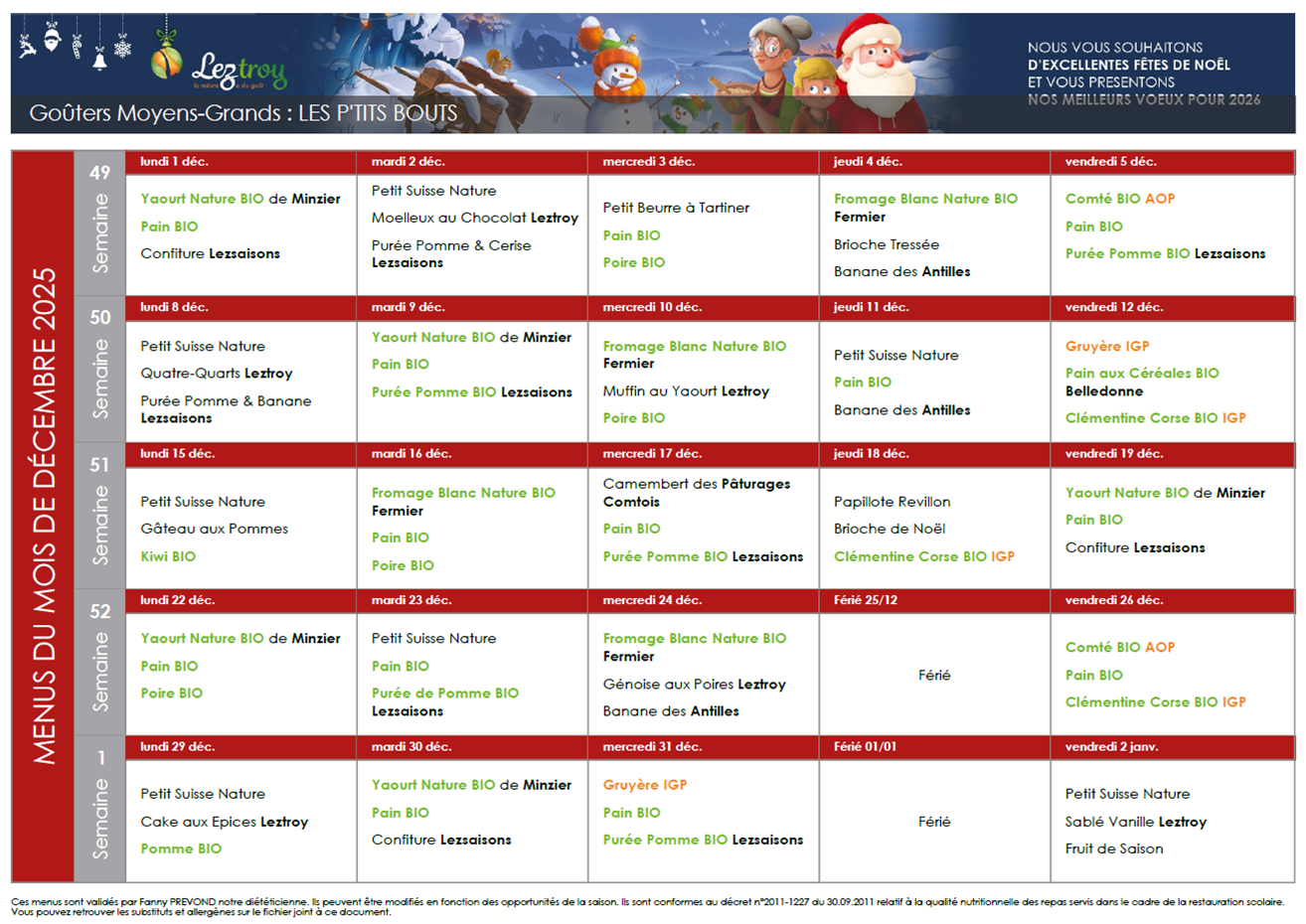Menus goûters Moyens-Grands