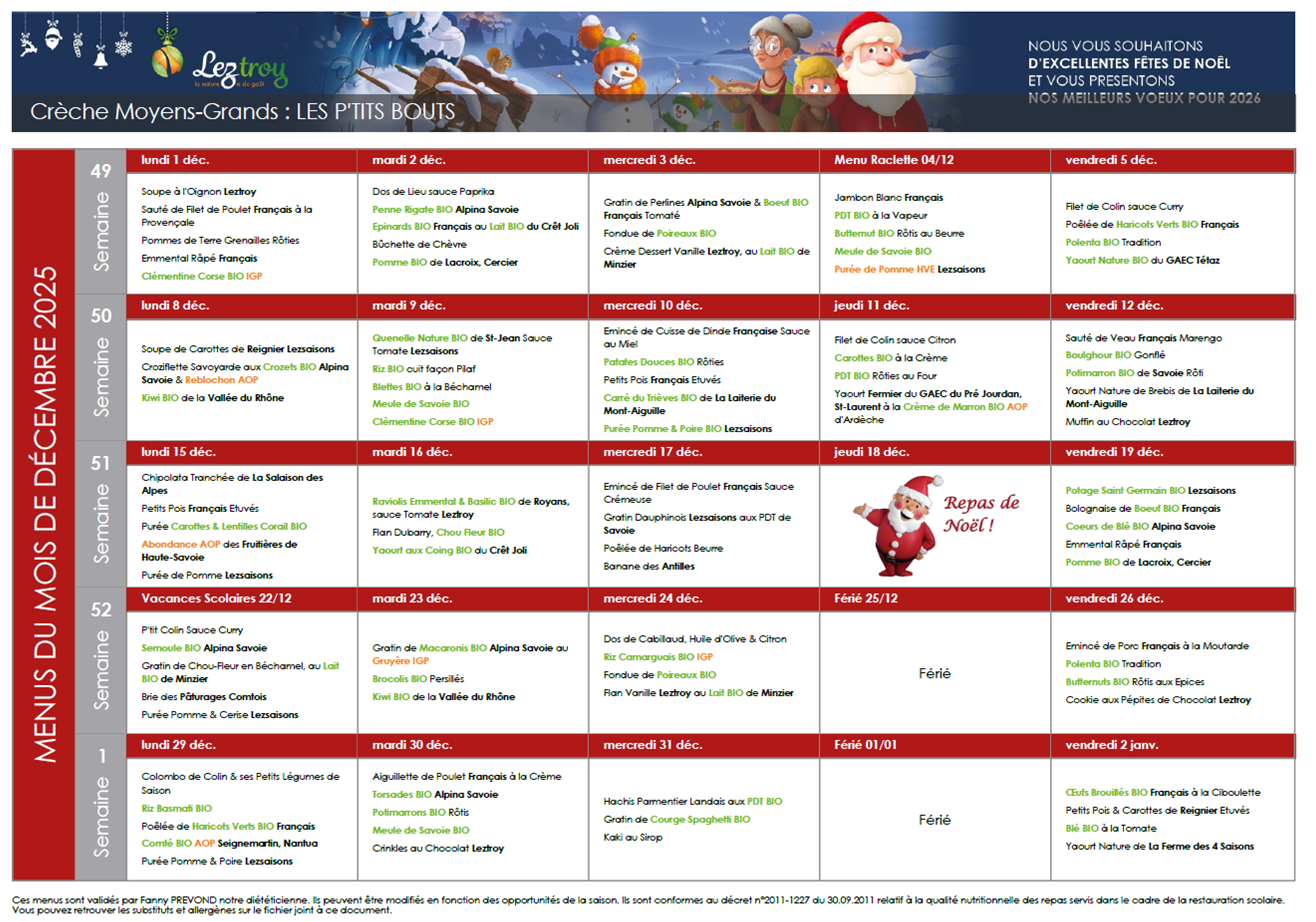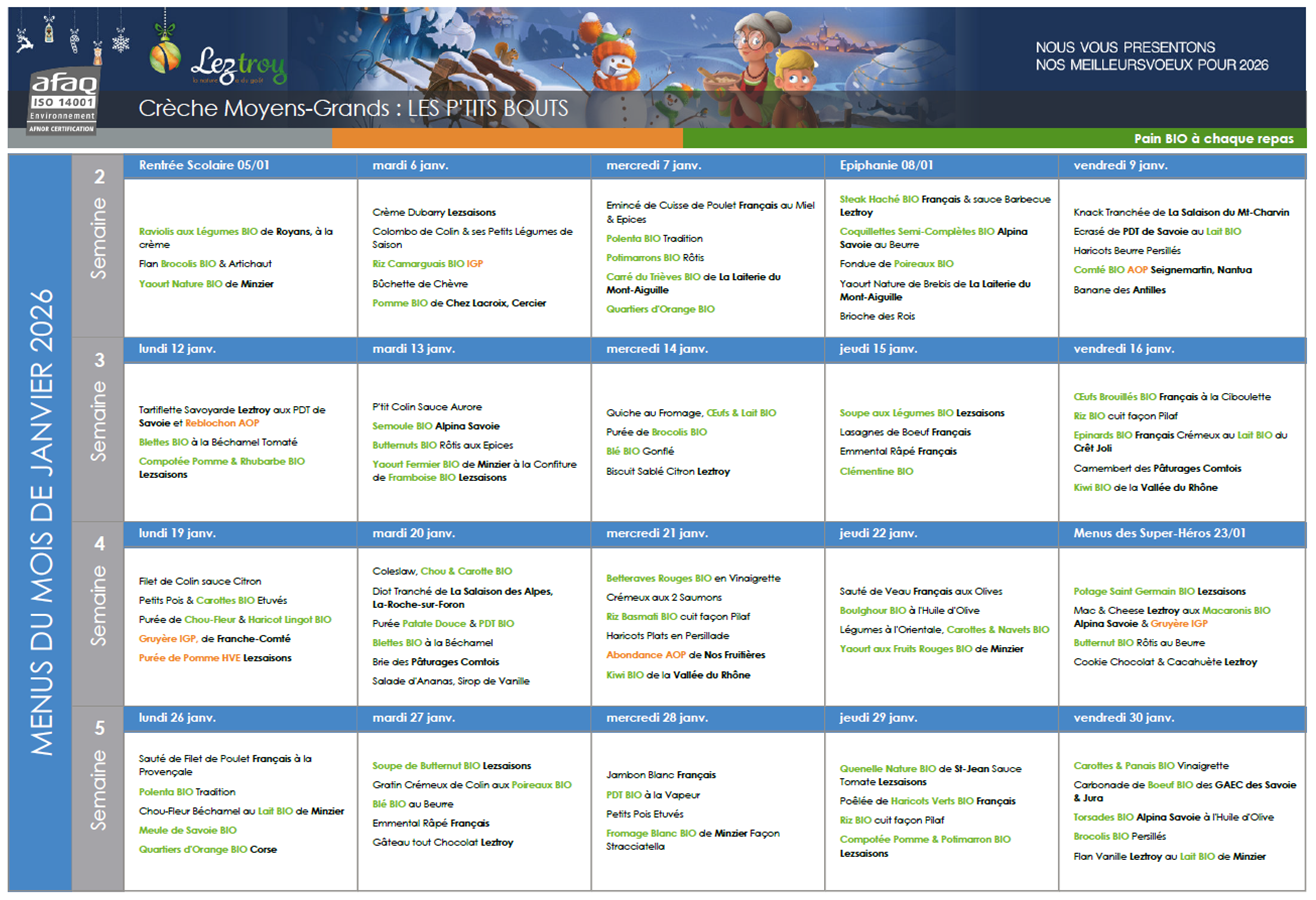 Notre fournisseur de repas, LEZTROY, situé à la Roche-sur-Foron, propose aux enfants des repas eco-reponsables et issus de produits les plus locaux possibles. Les repas sont livrés puis préparés et réchauffés sur place. Les engagements sont notamment :